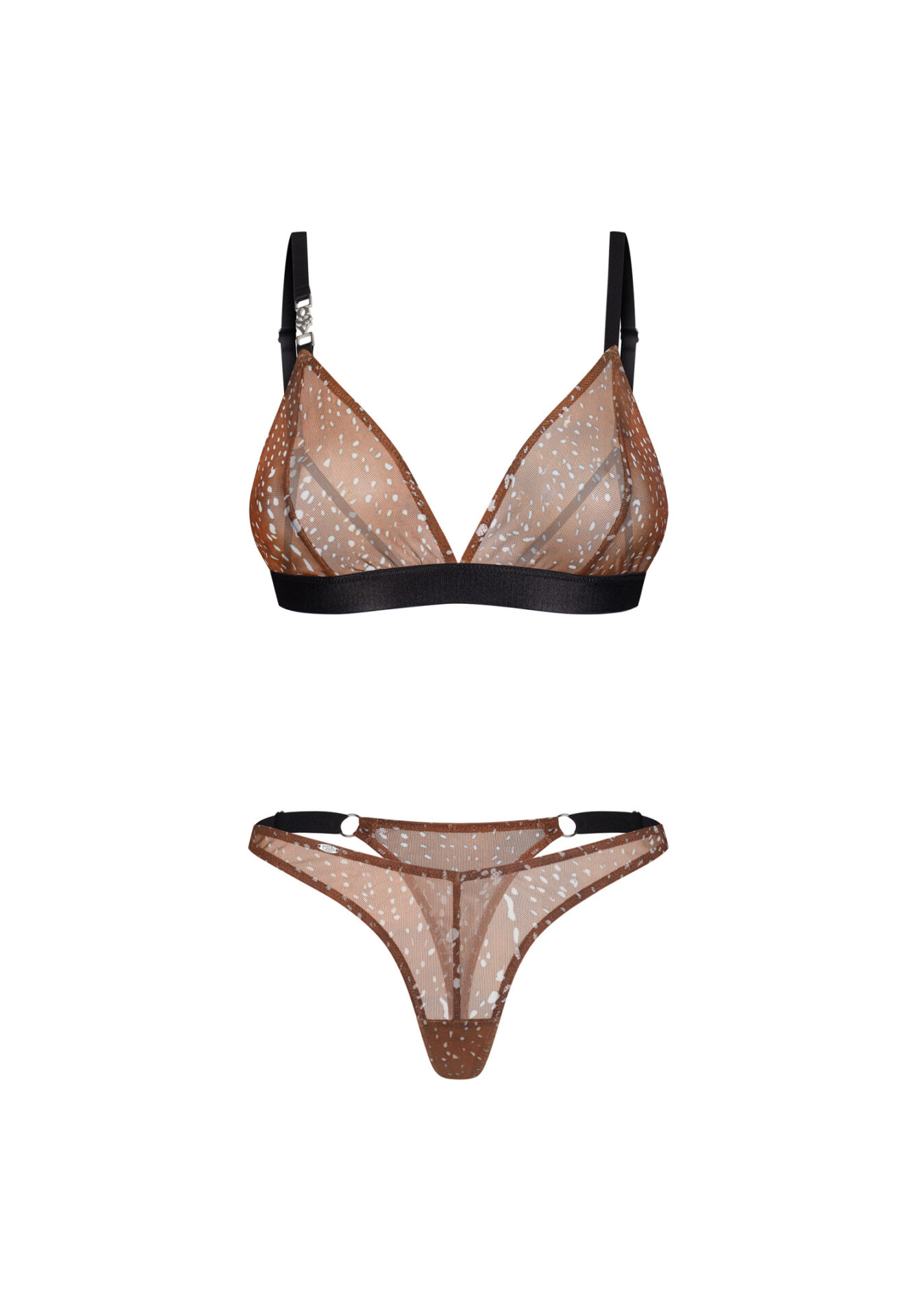 Weicher BH und String aus Mesh mit einem gepunkteten Muster, das dem Set einen leicht wilden, ungezähmten Charakter verleiht. Die markante Farbe und die auffälligen Details heben dieses Set von klassischen Dessous-Sets ab.